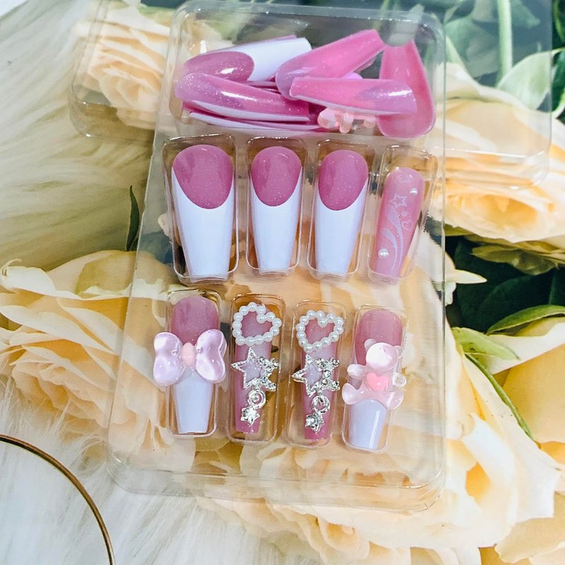 Extra Long Press on Nails Square French Tips Acrylic Coffin False Nails Sets Artificial Pink Fake Nails with Bear Pearl Designs Glossy Full Cover Glue Stick on Fingernails with Charm for Women