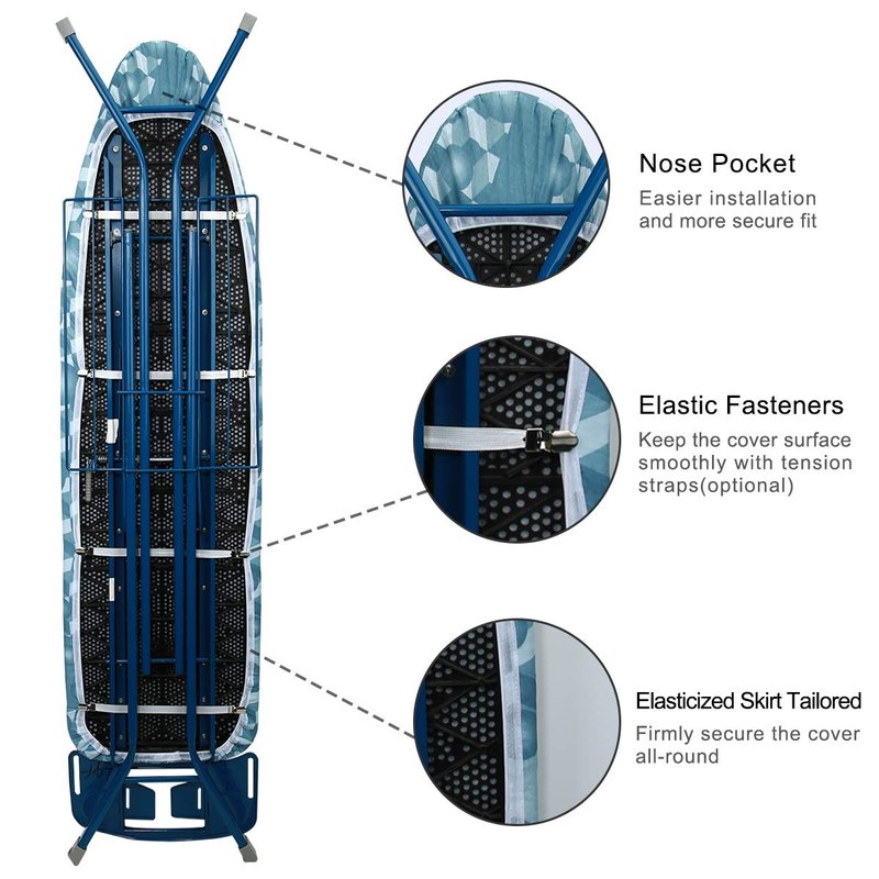 - THE SECRET OF FASTER AND EASIER IRONING - Premium elastic edge of the ironing board cover tailored firmly secure the ironing cover all-round for tightly fit. Guarantee Not easy to MOVE or SLIP. 4 sets of elastic fasteners(optional) pull the cover surface tight and straight with tension straps for universal fit. You will be surprised that the ironing works becomes smoother and better than normal. Make sure you faster and easier ironing and save your time on ironing chores.