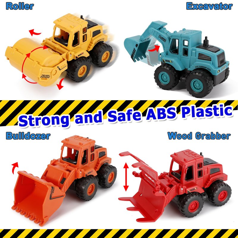 - 4 Pack Construction Truck Set: This vibrant push-and-go car toy playset includes 4 inertia construction vehicles—1 bulldozer, 1 excavator, 1 roller, and 1 wood grabber. It's a hit with kids and great for both boys and girls ages 3 to 12.
