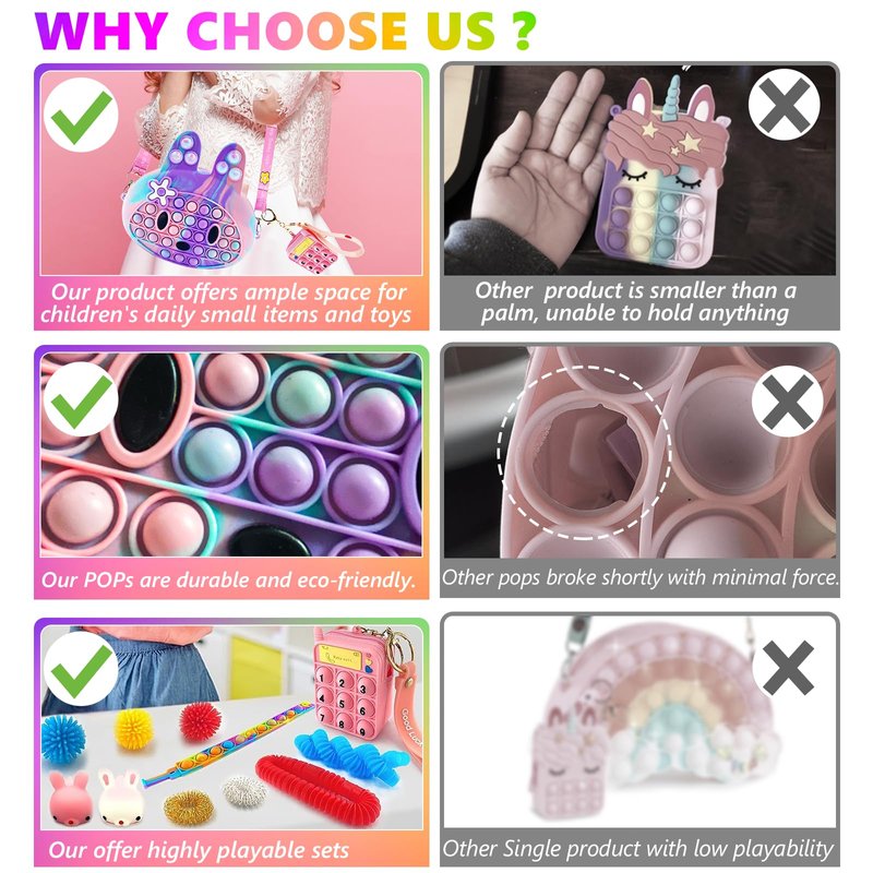 Exun Pop Crossbody Purse Bags Fidget Toy Pack, Push It Bunny Shoulder Bag Small Mini Sensory Toys, 3 4 5 6 7 8 9 10 Year Old Birthday Party Gift for Girls Kids, Valentine Christmas Stocking Stuffers