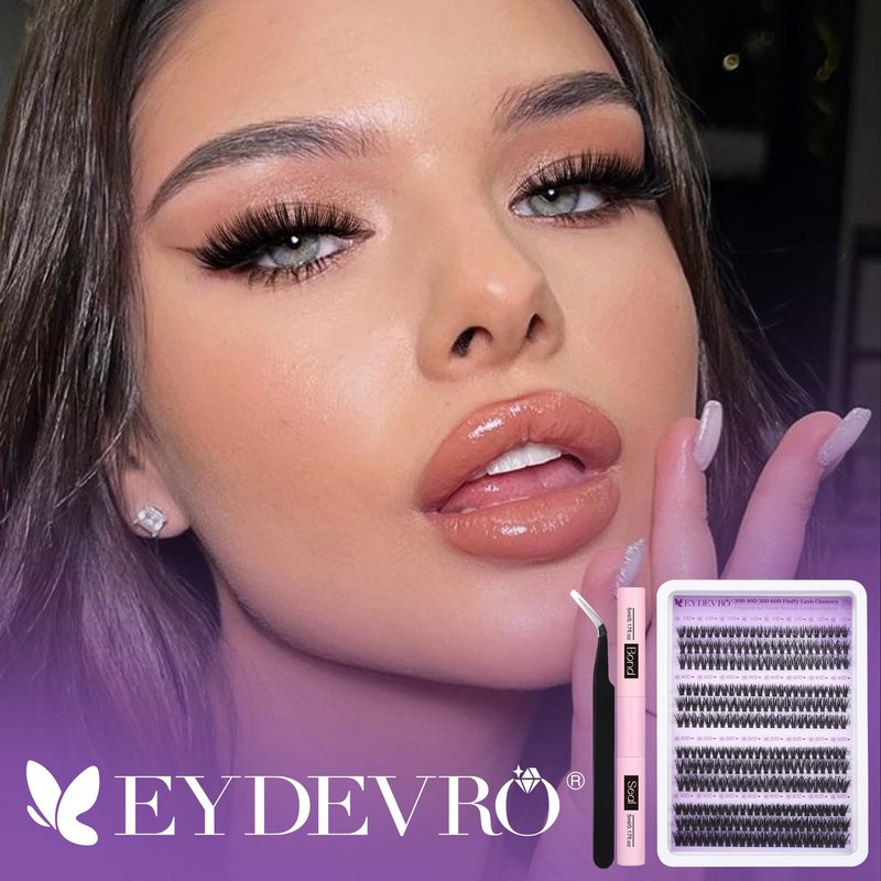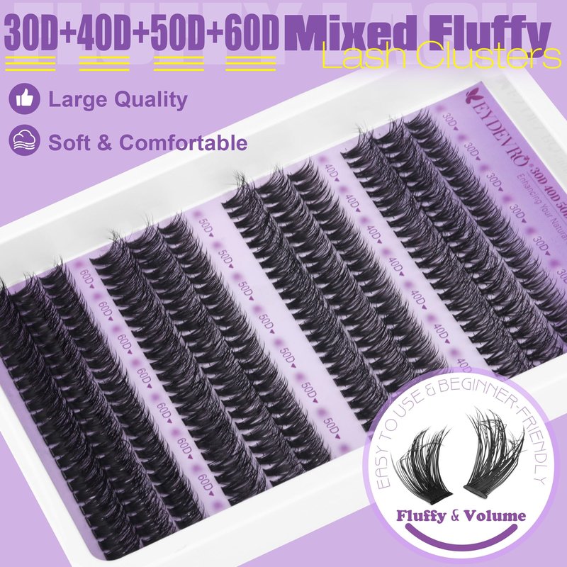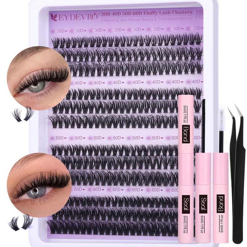 EYDEVRO Fluffy Lash Clusters Kit 30D40D50D60D Lash Extension Kit Cluster Eyelash Extension Kit 10-14mm D Curl Individual Lashes Kit Cluster Lashes with Waterproof Lash Bond and Seal Lash Tweezers