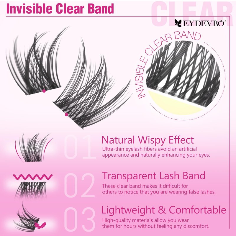 - Invisible Clear Band Lash Clusters: Unlike traditional black lashes that can sometimes look heavy and artificial, the transparent lash band of these eyelash clusters blends seamlessly with your natural lashes, giving the impression that they are an extension of your own; These clear band individual lashes add a natural touch, making it difficult for others to notice that you are wearing false lashes; The result is a look that is fresh, delicate, and incredibly natural