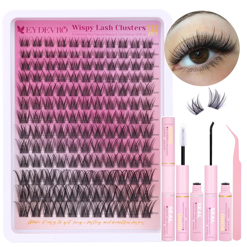 EYDEVRO Wispy Lash Clusters Kit Natural Lash Extension Kit Clear Band Cluster Lashes Eyelash Extension Kit 143 Pcs Invisible Band Eyelash Clusters With Waterproof Lash Bond and Seal and Lash Tweezers