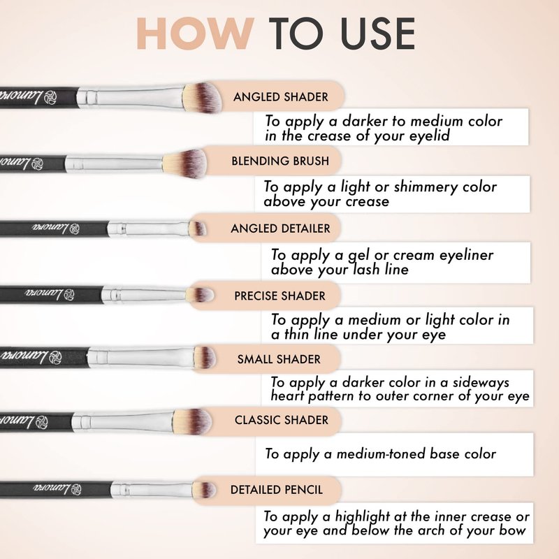 - EYESHADOW BRUSHES SET - with 7 professional quality eyeshadow makeup brushes. Perfect for applying, shading and blending eyeshadow or eyeliner. This essential eye makeup brush set includes an eye blending brush, crease brush, blender brush, and eye shadow brushes. You will fall in love with this eyeshadow blending brush set when it arrives at your door step and it will make you want to throw away your old eye brushes.