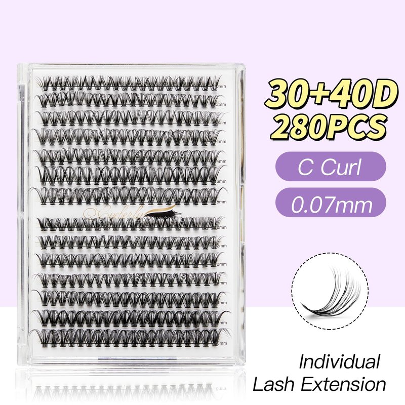 EYEBERLY Individual Lashes, 280pcs 30+40D Wispy Lash Clusters, C Curl Lash Extension, Natural Looking DIY Faux Mink Cluster Eyelash Extensions at Home (30D+40D-0.07C-9-18mm)