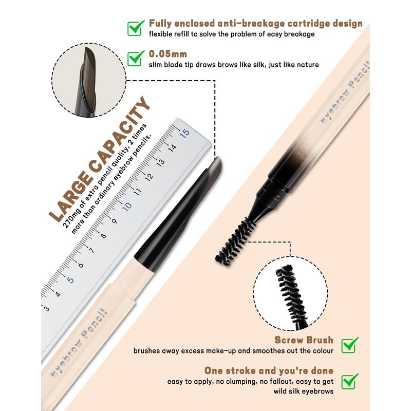 - Waterproof & Long Lasting- This eye brow pencil is waterproof, smudge-proof and long-wear. It is composed of high-quality ingredients, soft textured and highly pigmented, glides smoothly, delivering evenly colored brows even when layered a several times, can last all day