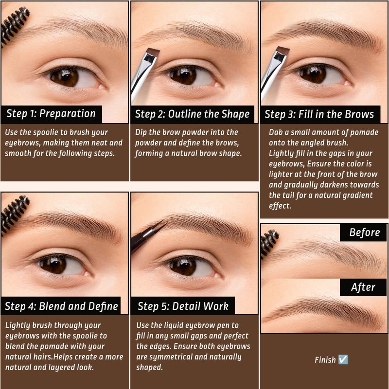 - Eyebrow Kit Contents: Includes brow pomade, dual-tip microblading pen, dual-ended angled brush with spoolie, and a stylish PU leather storage pouch—suitable for both beginners and professionals