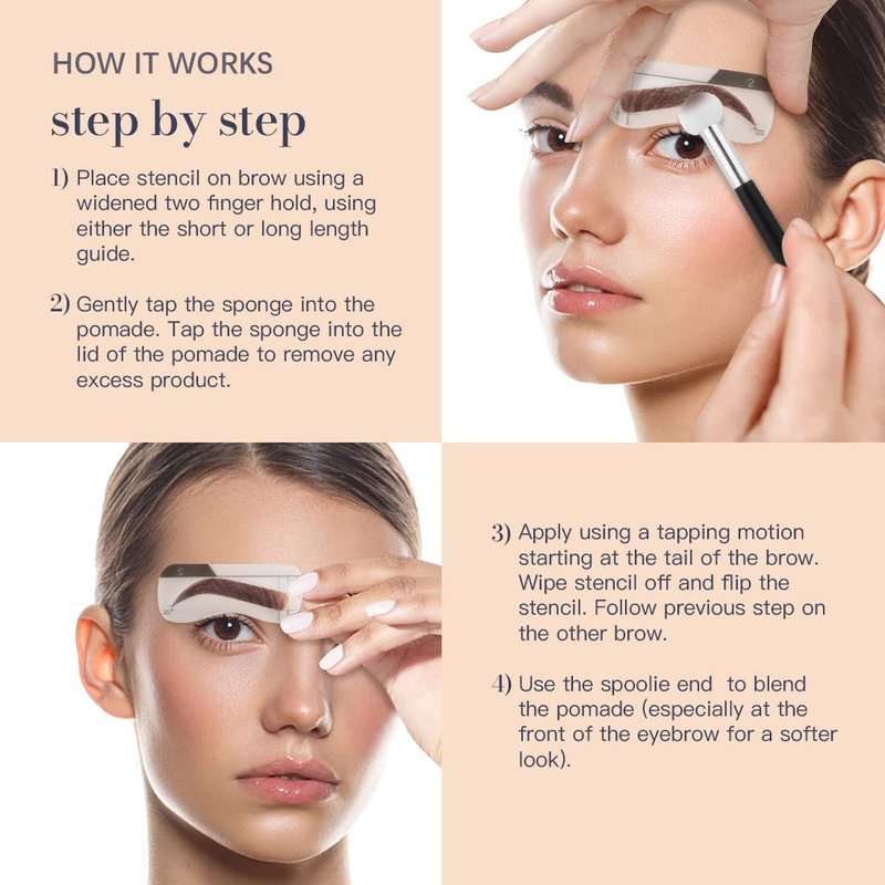 - Your little brow helper: 10 reusable brow stencils, 1 double-ended brush, 1 sponge-tip applicator, 1 brow trimmer and a box of brow balm. Multi-color optional.