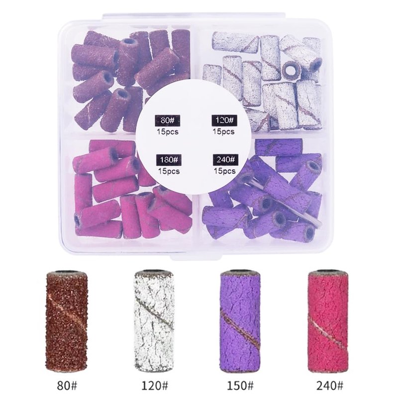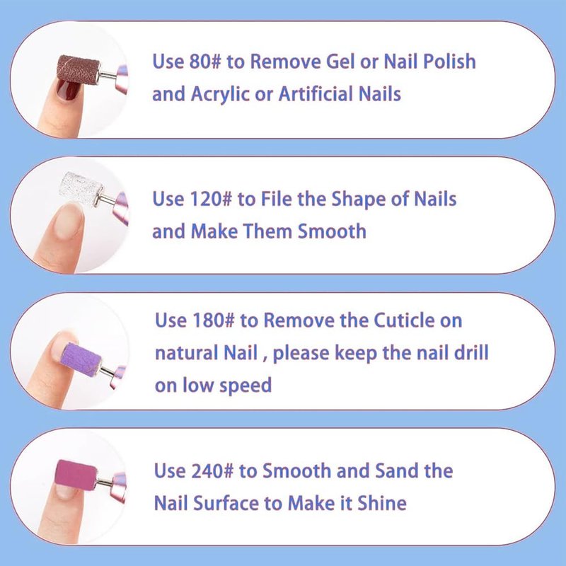 - Multiple Grit Size: 80# helps you sand hard glue and can quickly remove polygel from nails; 120# helps you quickly prepare nails, file the nail surface, shape and smooth; 180# has a smooth surface and can be used at the low speed of the file,perfect for polishing natural nails and cuticle remove;240# helps you smooth and polish your nail surface to make it shiny.
