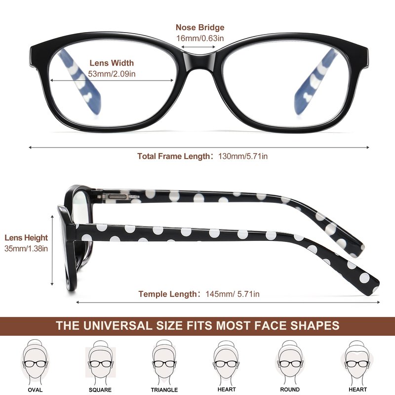- Lens width: 2.1 inch(53mm), Lens height:1.38 inch(35mm), Nose bridge width: 0.63 inch(16mm), Temple length: 5.71 inch(145mm),Total Frame Length: 5.71 inch(130mm), the universal size fits most face shapes.
