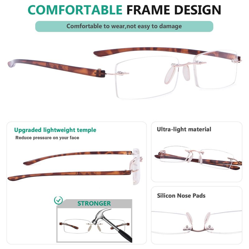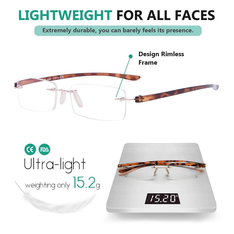 - ►[ RIMLESS DESIGN ] - Rimless fashion frame is the trend for you today. Superior technology allows reading glasses to fit well on a variety of faces, showing your uniqueness and taste.