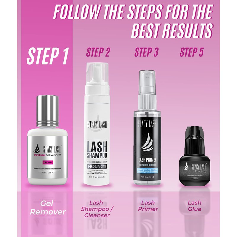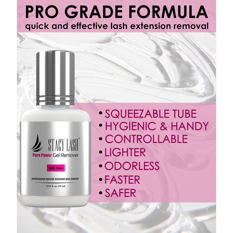 - Fast action - from 60 seconds - the Stacy Lash Pure Power Glue Remover has new super active power formula. It will dissolve lash adhesive just in 60 seconds, offering quicker and more efficient lash removal. The strong solvent will quickly remove even the most steadfast types of eyelash extension glues.
