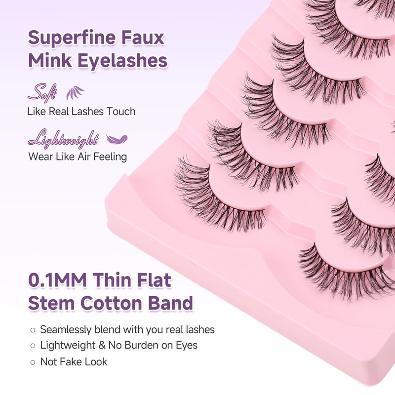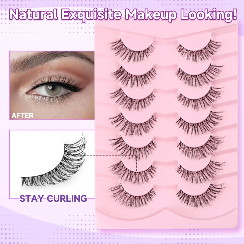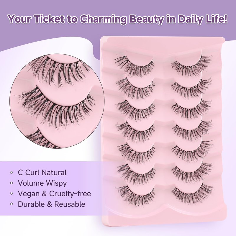 - VEGAN & REUSABLE: 7 pairs cat eye lashes pack. The fake eyelashes use ultra-light faux mink fibers, cruelty-free, skin friendly. Bring pretty natural lash extensions look without damaging your own eyelashes, suit for DAY-TO-DAY use, wedding, vacation and so on