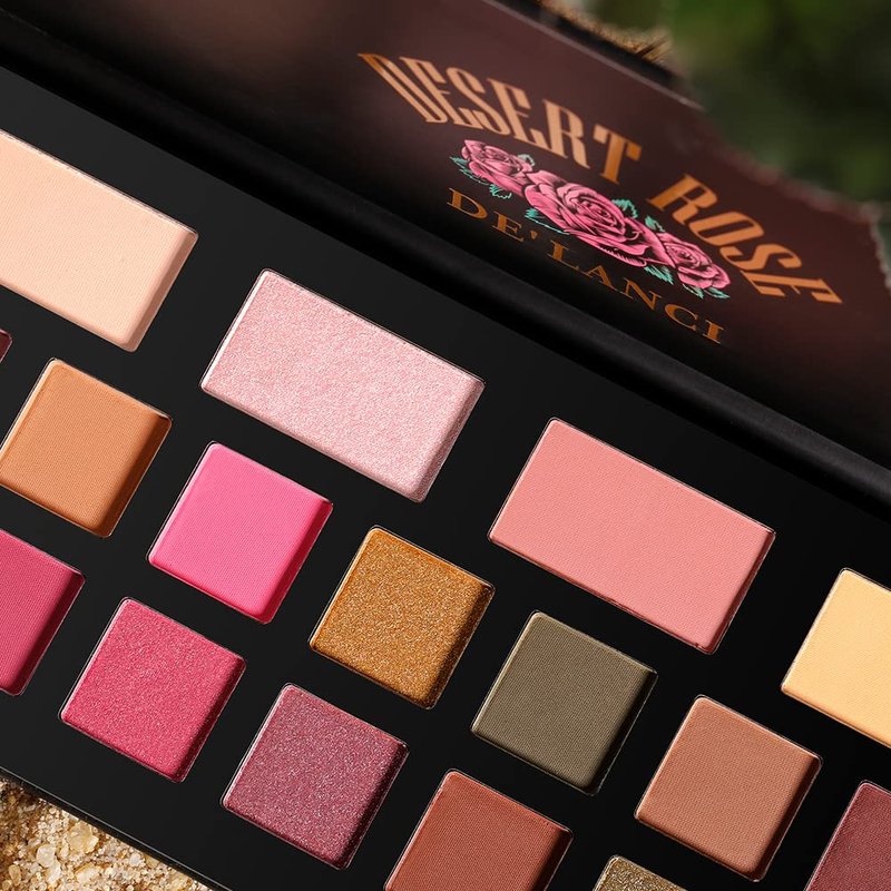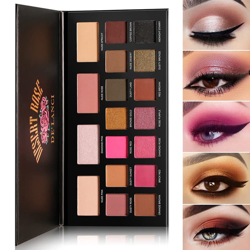 - 【 DE’LANCI 2022 NEW ARRIVALS NUDE EYESHADOW PALETTES】: Desert Rose eyeshadow makeup palette is with 18 rose-hued neutrals shades which are made from smooth high pigmented velvety texture powder, including brown tone matte,dust pink mattes, rose gold shimmers ,mauve matte,pale pinks,blushy taupes, glimmering metallics, shimmery rose pink finish, black stain, taupe matte and a few transition shades to complete the romantic look and has everything you need to create daily lookings.