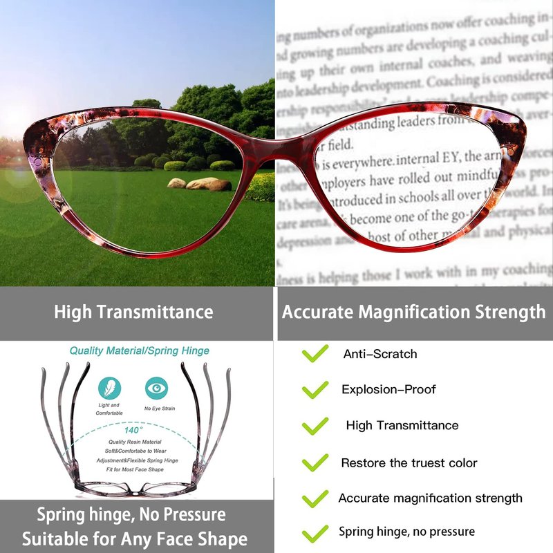 - 【High Quality Spring Hinge】The ladies reading glasses are designed with high quality spring hinges. Cat eye frame, lightweight and comfortable, Does not oppress the head, suitable for most face types.
