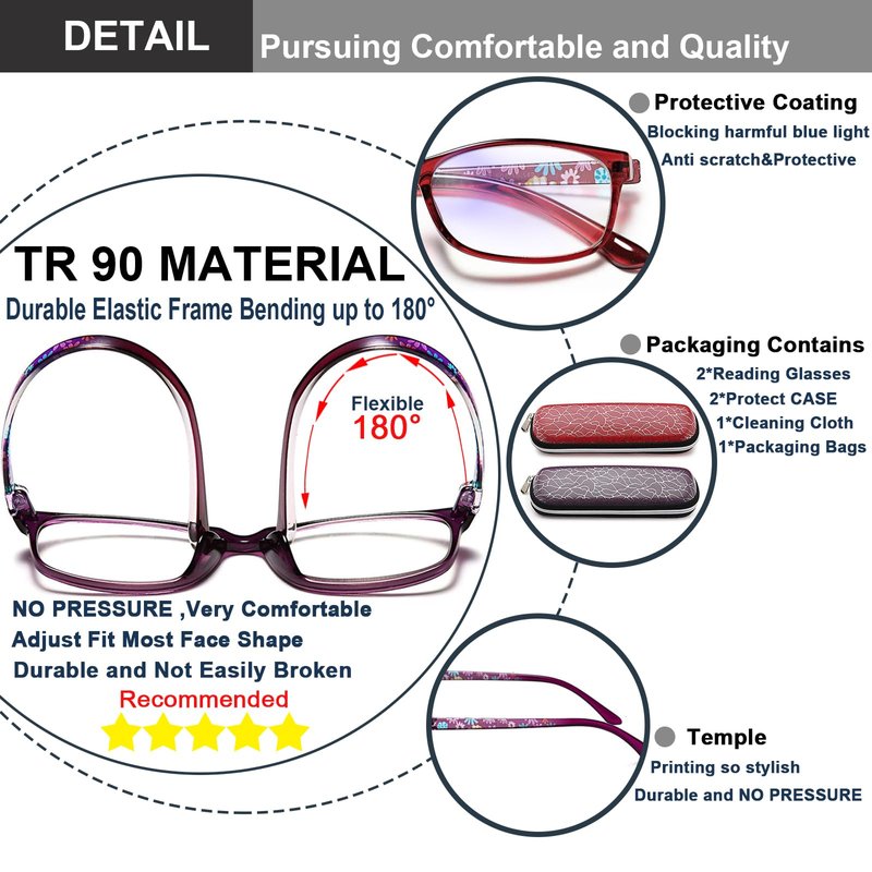 【Package Include】2 Pair of women reading glasses +2 Beautiful glasses case + 1 High-grade glasses cloth.