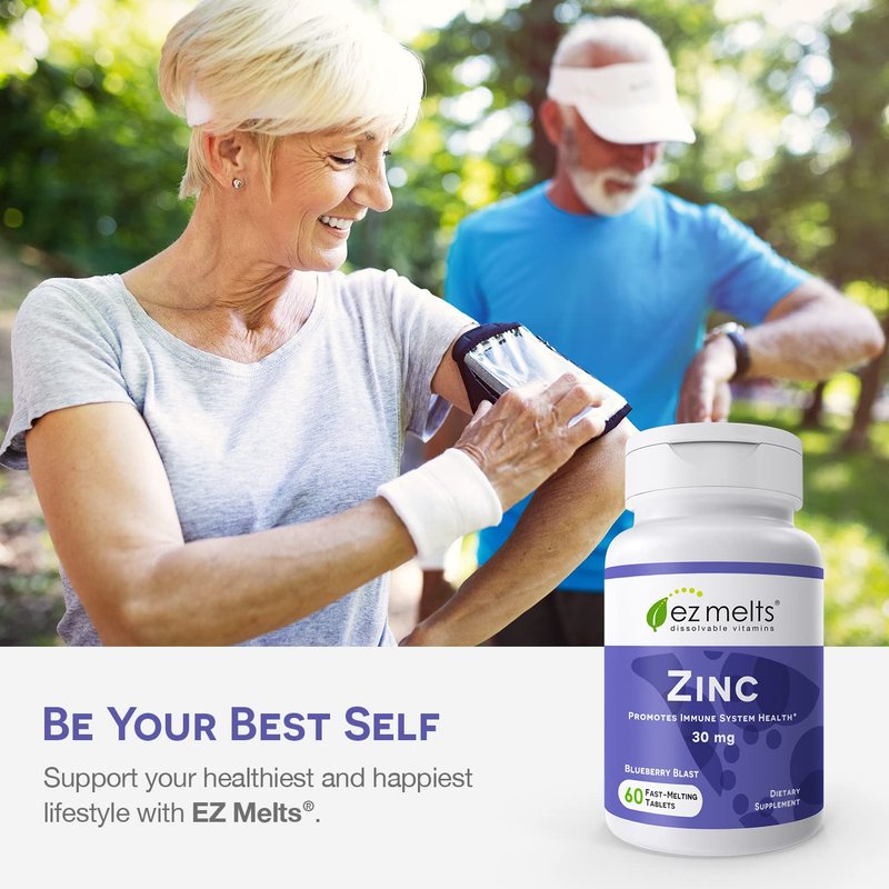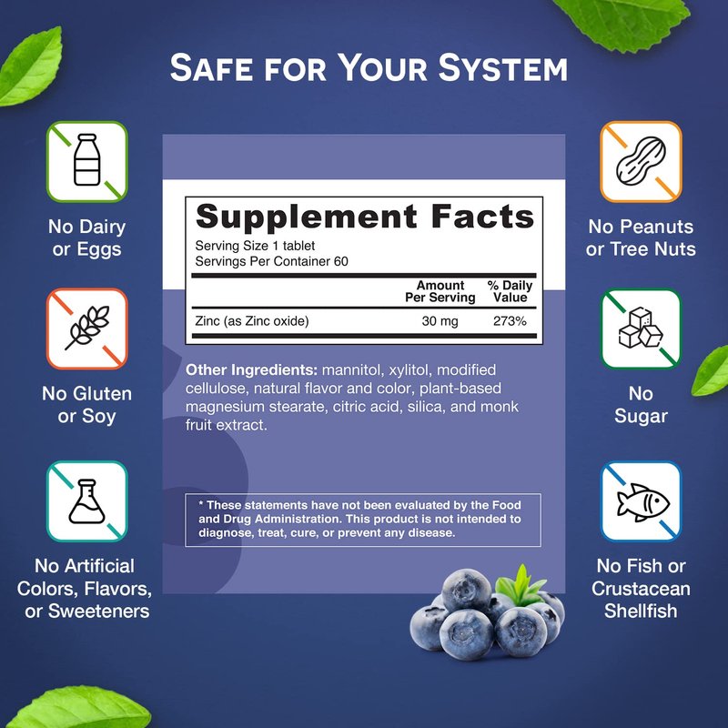 - Melts In Your Mouth — No chewing or swallowing an entire tablet necessary. Your one-a-day zinc women and men’s vitamins dissolve right on your tongue. With zero sugar, these zinc 30 mg supplements will delight your senses without compromising your diet. Taste the zing of blueberry!