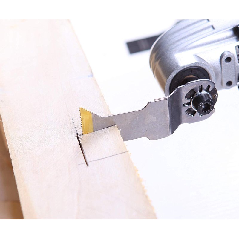 EZARC Titanium (TiN) All-Purpose Speed Cutting blades Set is specifically designed for multi-material cutting. The new titanium oscillating saw blades with extra-long length perform longer lifetime and faster cutting speed. The high-quality titanium coated tooth strip makes the saw blades especially wear-resistant in demanding heavy duty applications, e.g. for screws, nails or laminate, hard wood. The wave set teeth design reduces the strain and remove chips effectively, less burning happen for wood cutting.
