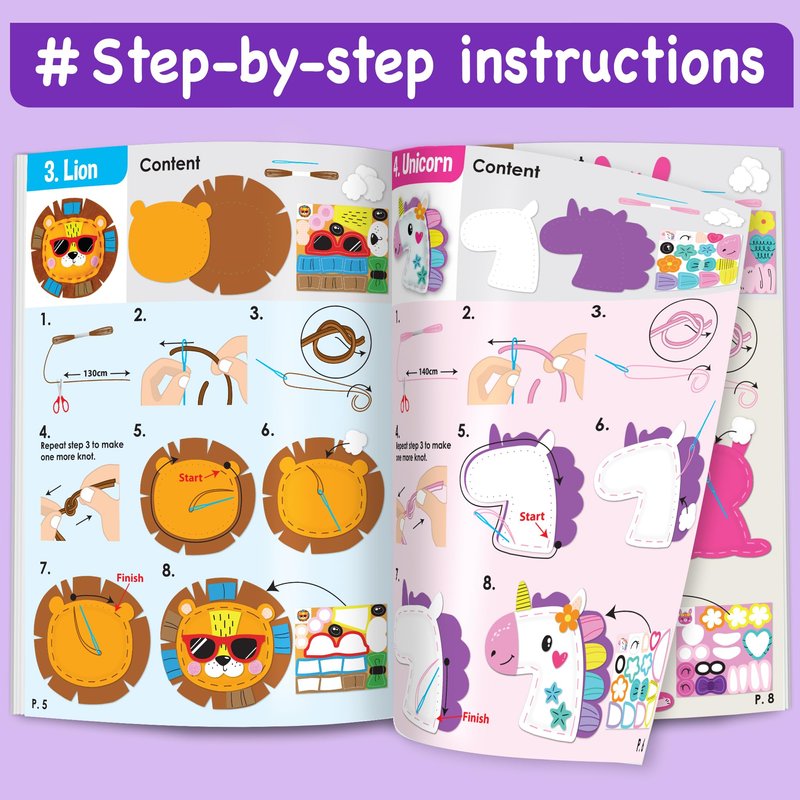 - 🌟No Mess, Easy-to-Follow Instructions🌟This sticker kit provides a mess-free crafting experience, including Step-by-step instructions and basic sewing skill brief, pre-punched holes, pre-cut shapes and jumbo plastic needles that prioritize children's safety without sacrificing their joy.