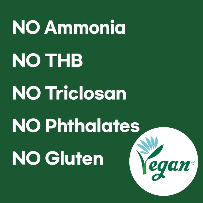 - Free of 6 ingredients: Animal derived ingredients, ammonia, phthalate, gluten, THB, triclosan