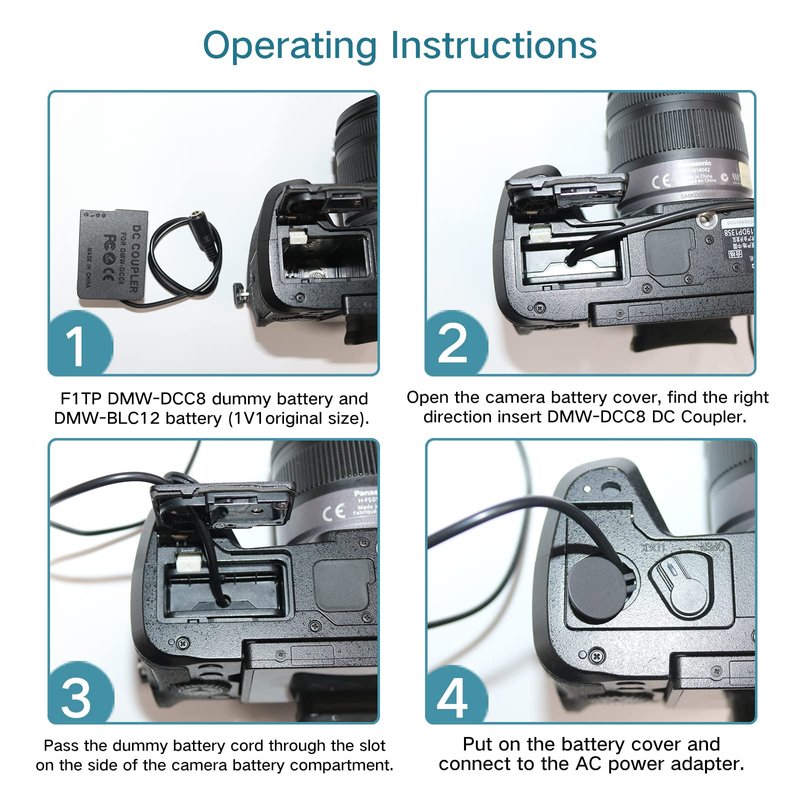 - 2.【Function】 DMW-DCC8 Dummy Battery Kit Replacement Panasonic DMW-BLC12 battery, to solve the trouble of frequent battery replacement, to continuous power for the camera, to meet long-term shooting of pictures and vlog videos.