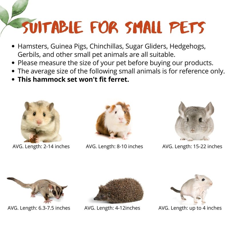 - 【Suitable Pets】Hamsters, Guinea Pigs, Chinchillas, Sugar Gliders, Hedgehogs, Gerbils, Marmosets and other small pet animals are all suitable to use this hammock set.