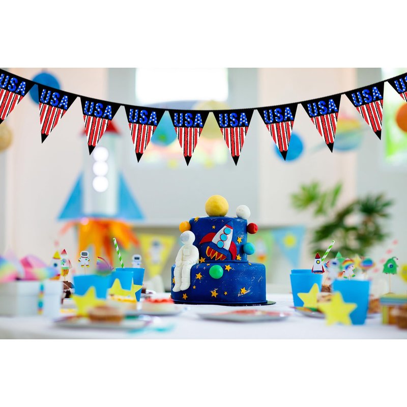 - Party Decorations: Welcome and celebrate the coming Fourth of July by using these awesome USA banner, will fill your room with great atmosphere, add an amazing touch to your 4th of July party. Perfect for 4th of july decorations, patriotic theme party decorations or other special occasions. You can hang it above the mantle, from the ceiling, wrapped around the tree, on the wall, or as a welcome sign on the front door, suitable for indoor or outdoor decorations.