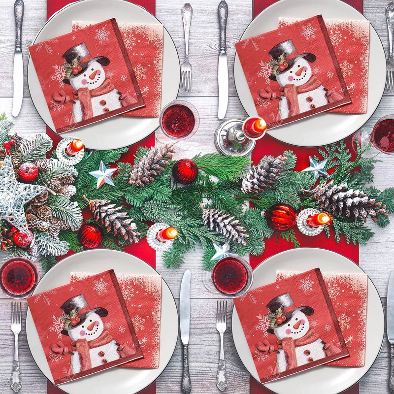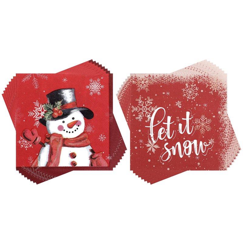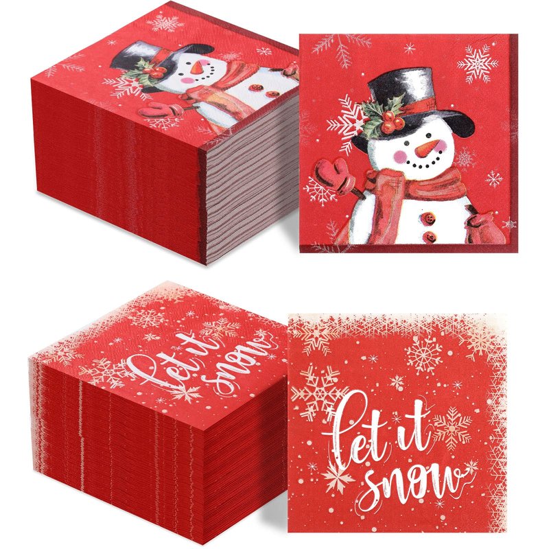 - Elegant Design: the Christmas cocktail napkins are designed with 2 different styles, one features a cute snowman wearing a top hat decorated with red berries and a scarf is smiling and waving to you; The other one is patterned with festive text [Let It Snow], which are paired with many beautiful snowflakes, which will make any lunch, dinner, dessert, brunch, drink, buffet bar look fancy