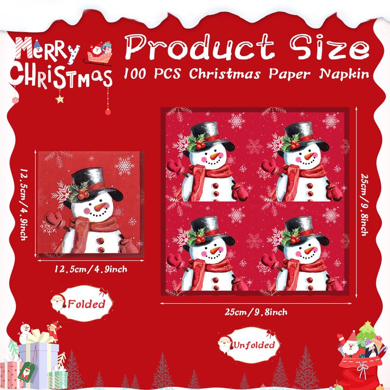 - Proper Size: the Christmas lunch napkins measure approx. 12.5 x 12.5 cm/ 4.9 x 4.9 inches folded, and about 9.8 x 9.8 inch/ 25 x 25 cm unfolded; The suitable size make these Xmas party paper napkins portable and easy to store and will not occupy too much space