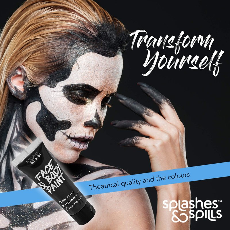Product Description With Splashes & Spills Makeup you can let your imagination run wild as you create a wide range of elaborate looks from the scary to the whimsical. This easy to apply face & body paint is the perfect way to kick your costume up a notch and add a dramatic element to your look. About This Product: - Face & Body Cream Paint (30 ml) - Squeeze Tube For Easy Application - Pro Formula Provides Great Coverage - Easily Transport It Without Making A Mess - Kind On The Skin - Perfect For Halloween, Costume Parties, Cosplay & Theatrical Effects - Available In Black, Red & White Splashes & Spills Face & Body Paint will be a hit at your next special occasion! It is the perfect finishing touch to your look for Halloween, costume parties, the stage and more! This body paint is durable and long lasting and perfect for creating lots of stunning looks, such as clowns, mimes, ghosts, vampires, and much more. The nourishing formula glides smoothly on the skin for easy coverage and won't irritate even sensitive skin, making it perfect for use on all skin types. The compact squeeze tube bottle is convenient for carrying from place to place making it an excellent choice for professional makeup artists. The special formula provides full and even coverage and provides long lasting wear. It is super easy to apply and remove with soap and water. It's tried, tested and proven to be kind to the skin. Be the star of the party with our face and body paints! Get a tube of our face and body paint and create truly stunning and fun looks that are sure to make a dramatic statement! At Splashes & Spills we are committed to providing you with high quality products that we know you'll love. If you aren't completely satisfied with your purchase contact us so we can be of assistance.