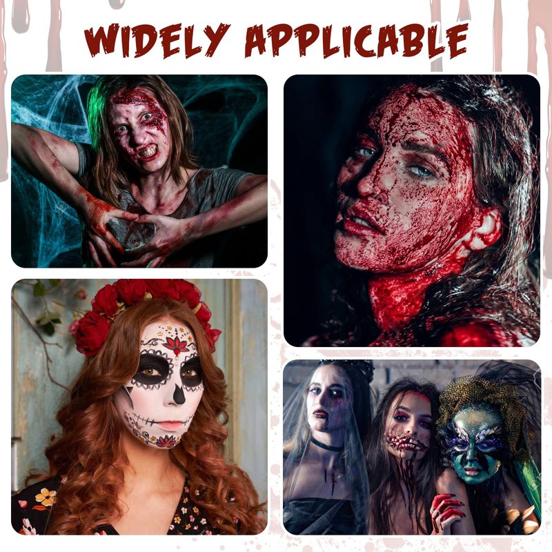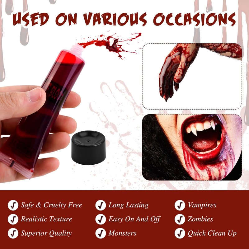 - ✔ Great fx Makeup Kit For Beginners: Easy to do a sfx makeup, perfect texture of blood cream and liquid fake blood. Can be used anywhere for a realistic bloody effect. Spray to body for face, arms and legs or the cloth; makeup, zombie costumes, props, and sets.