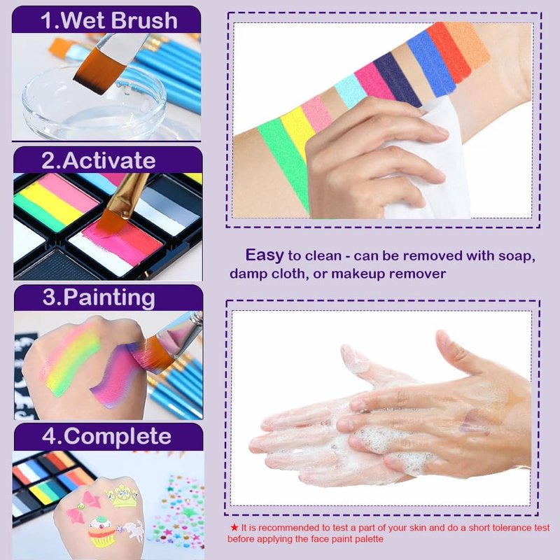 - Water-Activated - Unlike oil-based paints, our facepaint kits are bright, quick-drying, and easy to apply. Simply moisten a brush or sponge, dip into the color cake, and create your desired designs. The paint provides excellent coverage and can be easily removed with mild soap, water, or wet wipes, without harming the skin.