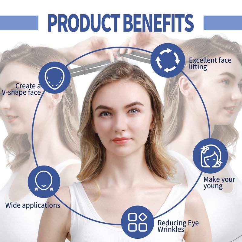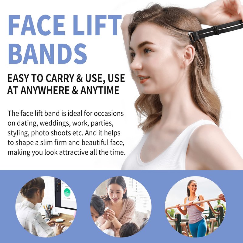 THE FACE LIFTING BAND ARE GOOD ELASTICITY, LIFTING YOUR FACE EYE SKIN EFFECTIVELY, HELPS TO SHAPE A SLIM BEAUTIFUL FACE PRODUCT BENEFITS Create a Vshape face Excellent face lifting Make your young Reducing eye wrinkles Wide applications Features: 1. Can perfectly adapt to the hair color. 2. The facelift bands is made of highelastic fabric, which is durable and can be reused many times. 3. The facelifting band with clip is designed to instantly lift the sagging skin around the face. It can lifting the face contour and reducing eye wrinkles to create a Vshaped face. EASY TO CARRY & USE, USE AT ANYWHERE & ANYTIME The face lift band is ideal for occasions on dating, weddings, work, parties, styling, photo shoots etc. And it helps to shape a slim firm and beautiful face, making you look attractive all the time. HOW TO USE Fix the small comb on both sides of the bun and adjust the position Then adjust the tightness of the band Adjust the bands position that you want