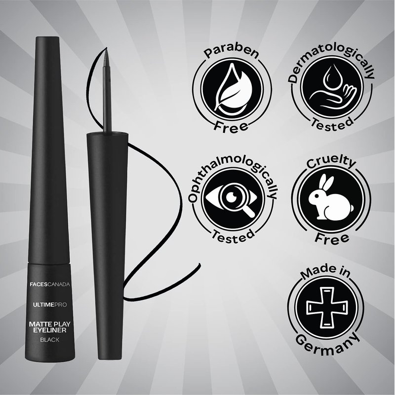 - The Faces Canada Matte Play Eyeliner is specially formulated in Italy for a better experience and is dermatologically and ophthalmologically tested.