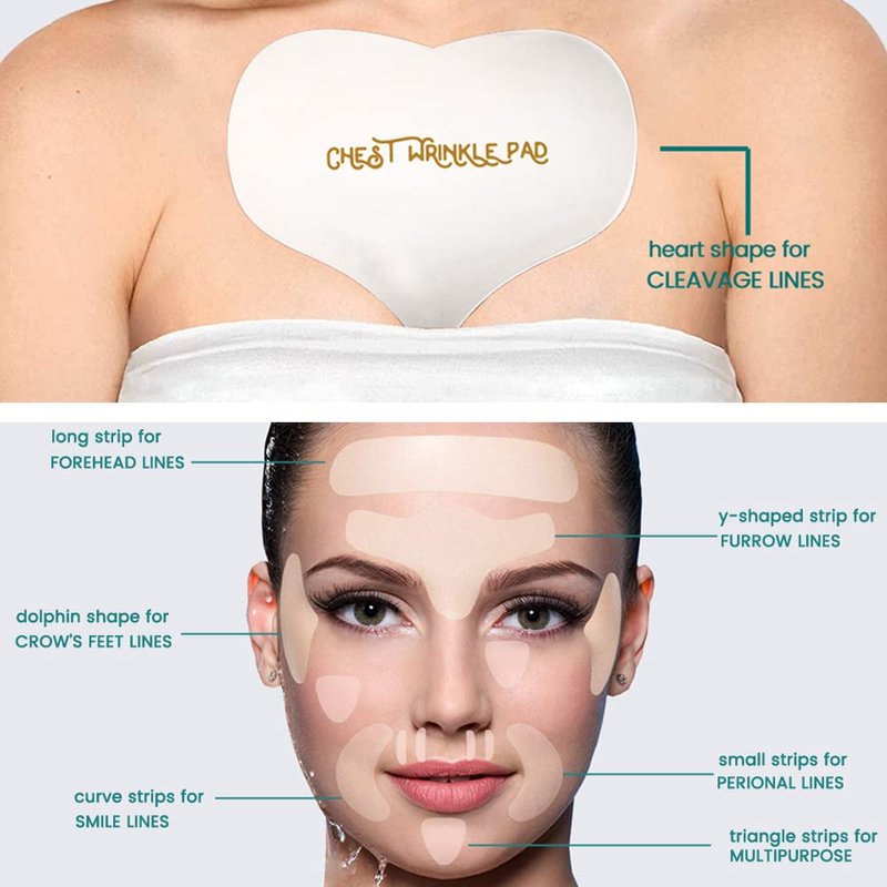 - FILLERS ALTERNATIVE - Gain a smoother, younger looking facial skin. This set includes 256pcs medical PE face strips in 6 different shapes, which are targeting to reduce and prevent facial and wrinkles, lines and crepey skin caused by facial expressions, sun damage or aging. Besides you can get 1 extra medical grade silicone chest wrinkle pad to smooth your cleavage wrinkles.
