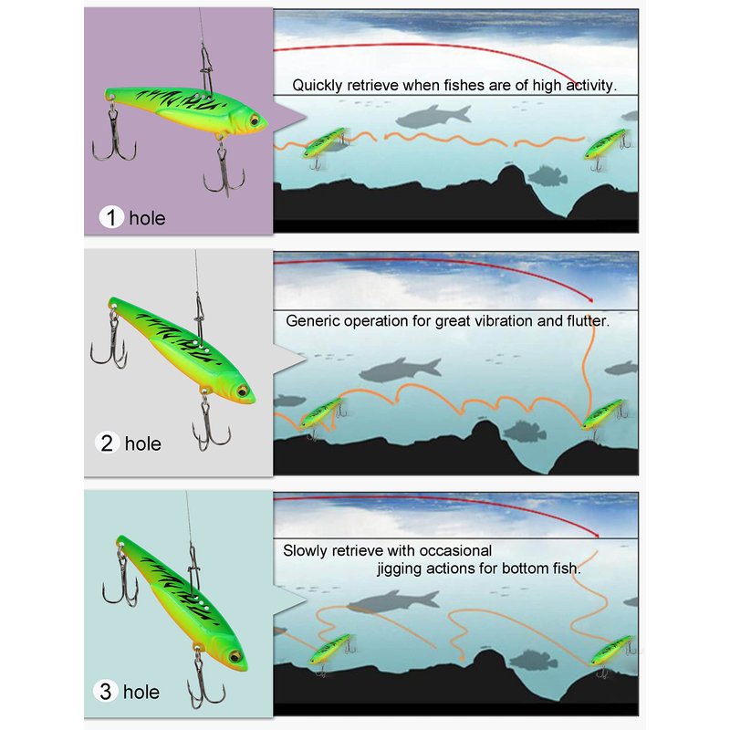 - 3 Operation Modes: 3 holes on upper leading face offers 3 different retrieve actions. First hole to quickly retrieve when fishes are of high activity; Second hole that generic operation for great vibration and flutter; Third hole to slowly retrieve with occasional jigging actions for bottom fish.