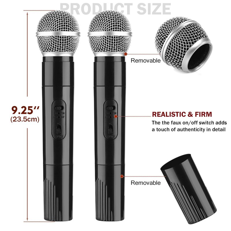 - 【Realistic & Firm】-- These fake plastic microphones look and feel very realistic, while the faux on/off switch adds a touch of authenticity in detail. The body of the mic is made of high quality hard plastic and the mic mesh head is made of metal and detachable, which is more realistic and durable than mere plastic. Same texture as a real microphone, but doesn't have the function of microphone and can't produce sound