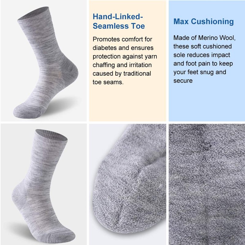 Merino wool diabetic crew socks with full cushion,seamless toe and non-binding top by Facool. These high performance crew diabetic socks for men and women are designed with ultimate moisture control system to keep feet cool and dry. Lightweight mesh instep provides good breathability. Padded bottom and hand-linked seamless toe closure are for extra comfort. For those who suffer from diabetes or circulation problem, people with swollen feet, ankles or calves caused by extreme lymphedema or any condition like it, it is important to wear correct socks. Our mens womens diabetic socks are perfect for diabetic foot and edema caused by circulatory problems. Feature: Seamless toe and non-irritating smooth toe seam. No smell and lightweight fabric suits for any season. Our calf-length socks will not impede the circulation of lower legs like other diabetic socks. Micromesh and breathing hole make the socks breathe and discharge the sweat perfectly. Stretchy non-binding top reduces the risk of infection, foot pressure and blistering. Perfect for those who have high demand for comfort, especially diabetics and the elderly. High quality (deodorant, smell free, durable with ventilation system). All the 3 pairs diabetic socks with special design package. Easy to carry around in your travel, great for home use, travel, business, even visiting the gym. Keeping the socks separated and organized.