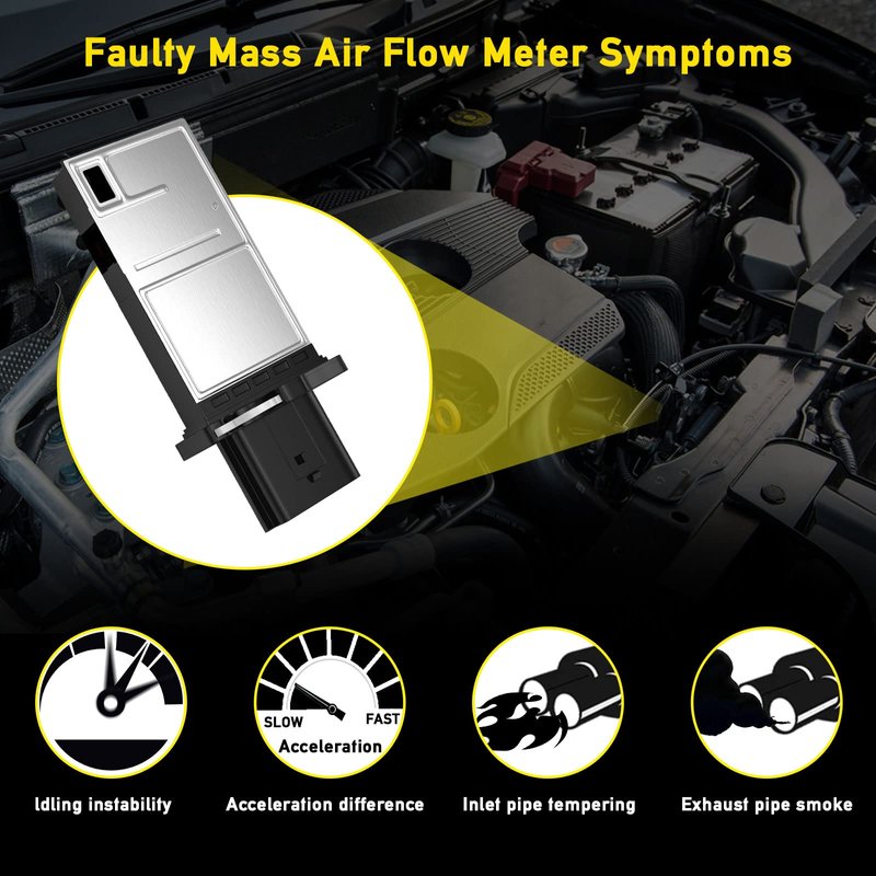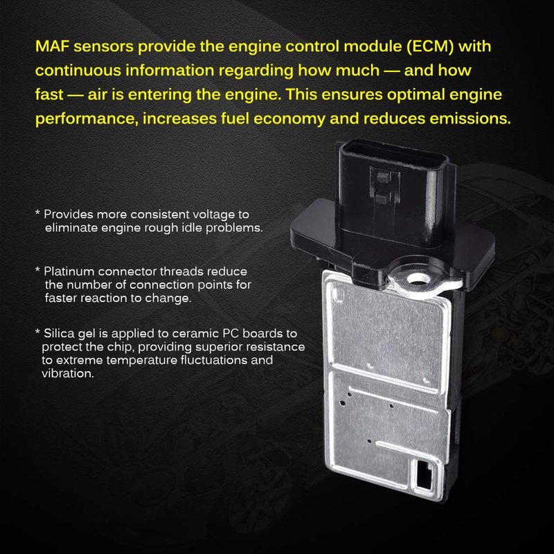 - MAF Sensor measures the volume and density of air entering the engine, providing highly accurate airflow readings to the ECU over a wide range of ambient temperatures.Plastic & Aluminum; Oupt Curver Tolerance: < 2%【NOTICE】 Please clean out the air box and replace the air filter before installating this Mass Air Flow Sensor Meter, or the Code and Check Engine Light may keep showing even if you replace a new MAF.