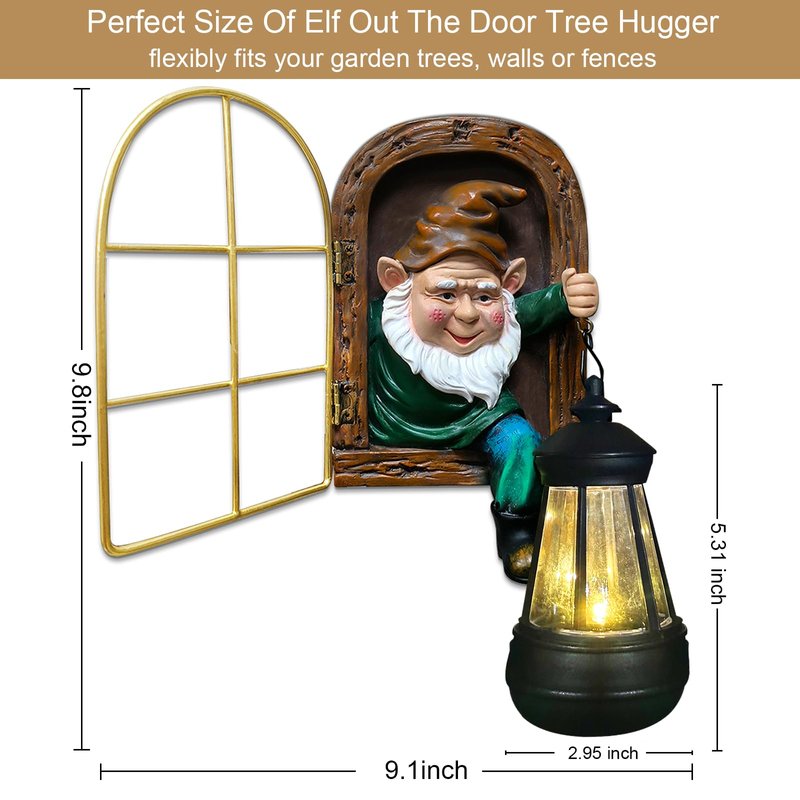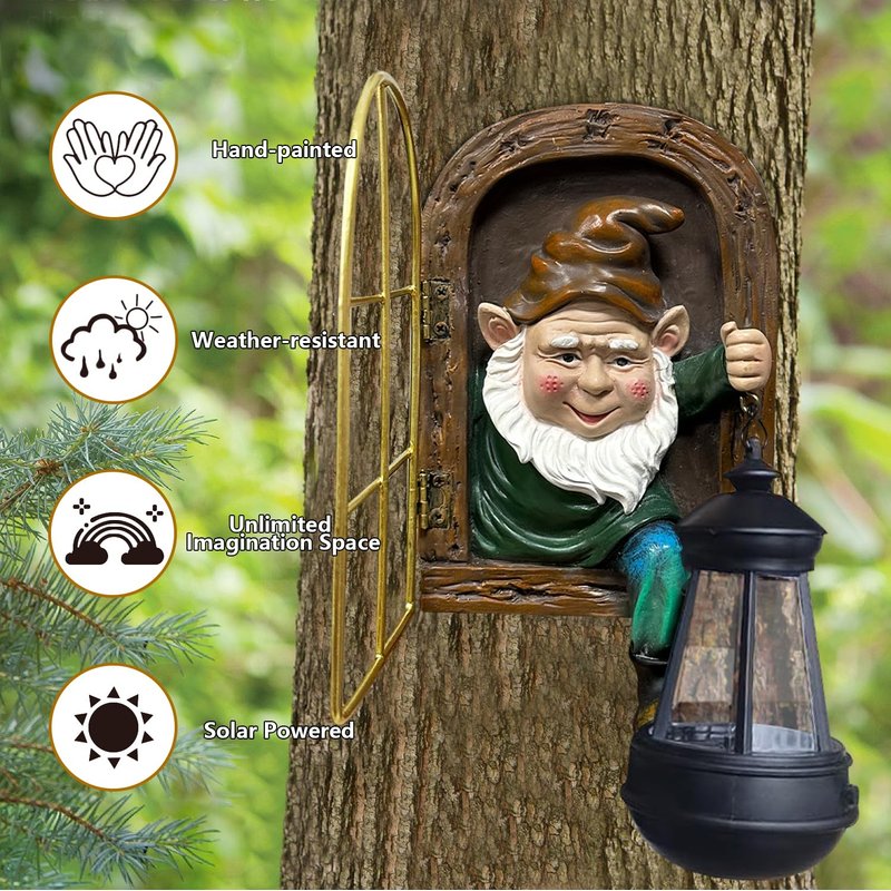 - 【Easily Assemble Whimsical Tree Decor】 - This tree faces decor outdoor is depicted as if the curious little old man with white beards is climbing out of a window to see something interesting, holding a small shining solar lantern. You can hang this gnome garden decor on your favorite tree, wall or fence with 3 keyhole brackets on the back and 3 screws provided to ensure it stay securely in place. The swinging window and soft lighting effect bring you a visual appeal and realism.
