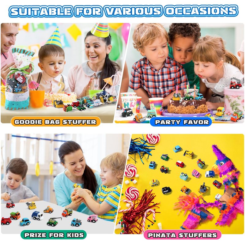 - đăPerfect Toddler GiftăThese cars toys is not only a perfect prize for kids, goodie bag and pinata stuffer because of its bright colors, cute shape and mini size, but also a perfect choice for cake decorations, party supplies, treasure box toys for classroom, and Christmas gifts for 2 3 4 5 6 years old boys and girls! WARNING: Small parts included in the product, children under 3 years old should be under supervision to play.