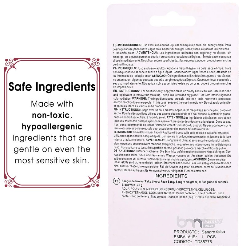 - Safe and Non-Toxic Formula:The fake blood is made from skin-friendly, non-toxic ingredients that are safe for both children (ages 7+) and adults to use. It’s gentle on the skin and washes off easily with soap and water.