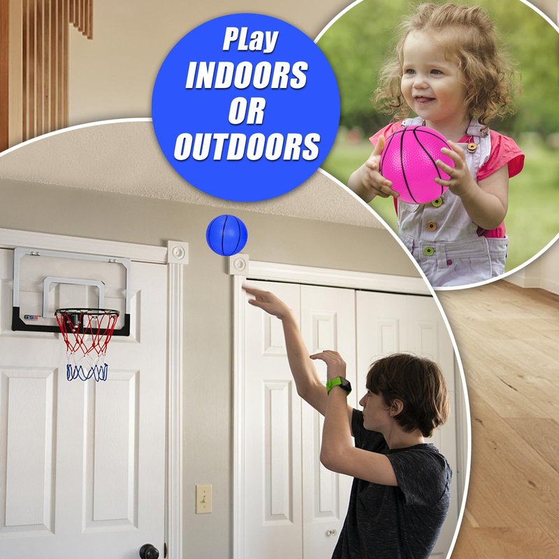 - ✪✪PACKAGE INCLUDED - 4 x Inflatable Mini Basketball with two different colors(blue and pink), 1 x Portable Air Pump; Every ball measures 6inches 7inches in diameter.it fits most mini hoops.