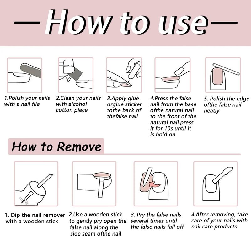 Product Description: Product Name: Press on nails Color: As the picture shows Quantity: 24Pcs Fake nails How to use: 1.Gently polish the nails and false nails with our complimentary nail file to get a better fit. 2.Clean your nails with alcohol cotton and wait for the nails to dry before proceeding to the next step. 3.Choose suitable fake nails and apply jelly glue on the back of the press on nails. 4.Press the fake nails on your nails and hold for 10 seconds. 5.Trim new nails to suit your needs. How to remove: 1.Soak your nails in warm water for 10-15 mins. This will soften the glue, making it easier to remove the nail. 2.Gently use a wooden stick to take it off peel pre-glued nails off from the side or just use your hand to peel it off. Considerations: -Don't wet your fingers within one hour of wearing fake nails. -Please avoid long exposure to hot water and soap for longer lasting. -Due to different lighting effects or display screens, the actual color may be slightly different from the picture. Thank you for your understanding.
