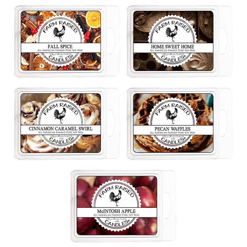 - FIVE UPLIFTING AROMAS; People love these melting wax scents from Farm Raised Candles for their delicious smell; Our collection of soy wax melts for warmers features five enchanting aromas including cinnamon caramel, pecan waffles, apple, fall spice and even vanilla wax melts