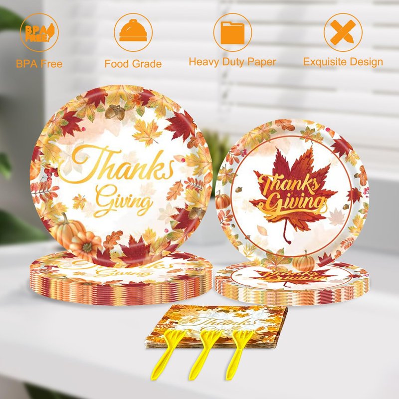 - Unique Thanksgiving Design: These fall party decorations supplies kit are designed specifically for the thanksgiving theme.The disposable thanksgiving party tableware feature maple leaves, fall fruits, pumpkin with etc fall elements, printed with "Thanksgiving" in unique lettering. Unique design creates a gorgeous atmosphere for thanksgiving party supplies dinnerware