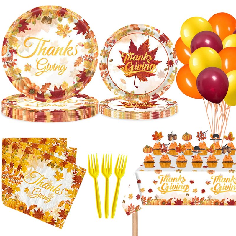 - Thanksgiving Party Supplies: You will receive 24 X 9 inch thanksgiving plates, 24 X 7 inch maple leaves plates, 24 pcs napkins, 24 pcs plastic forks, 1 pcs thanksgiving tablecloth, 18 X 10 inch balloons, 12 pcs cake toppers, 2 pcs ribbons, 1 pcs glue dots