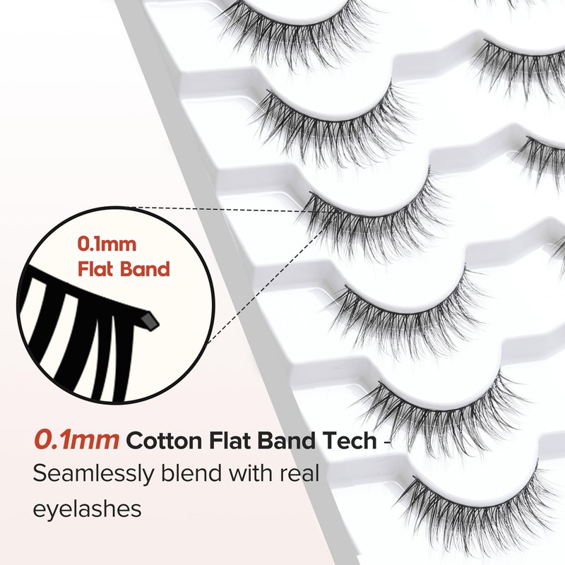 - THIN BAND FALSE EYELASHES: The wispy eyelashes use 0.1mm thin cotton flat band tech, seamlessly blend to your real eye lashes. Incredibly flexible, easy to bend and stay well on, beginner friendly