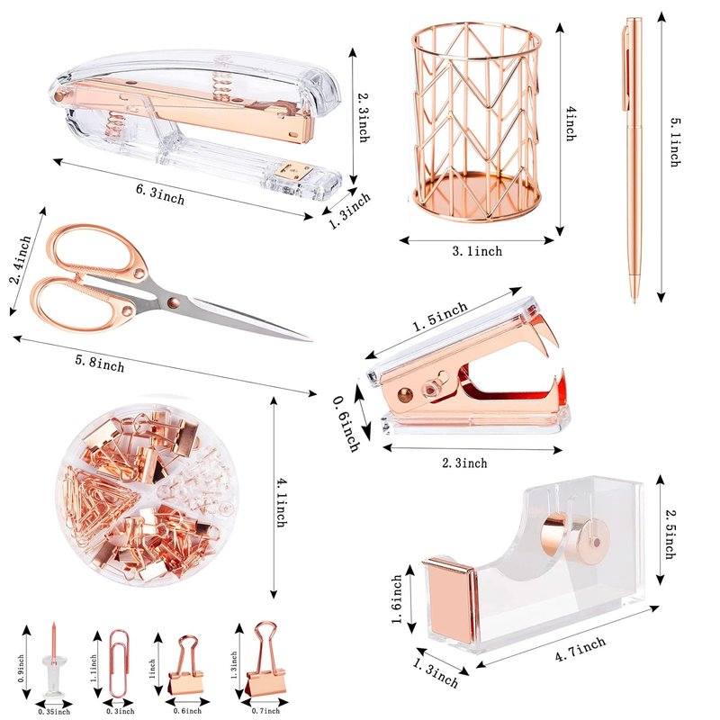 - Packing Listing: 1x stapler, 1x staple remover, 1000 x staples, 1 x tape holder, 1 x pen holder, 2 x pens, 1 xscissors and 1 x box of binder clips; This rose gold office supplies and accessories can meet your needs in daily life and work, keeping your desk or desk drawer organized.