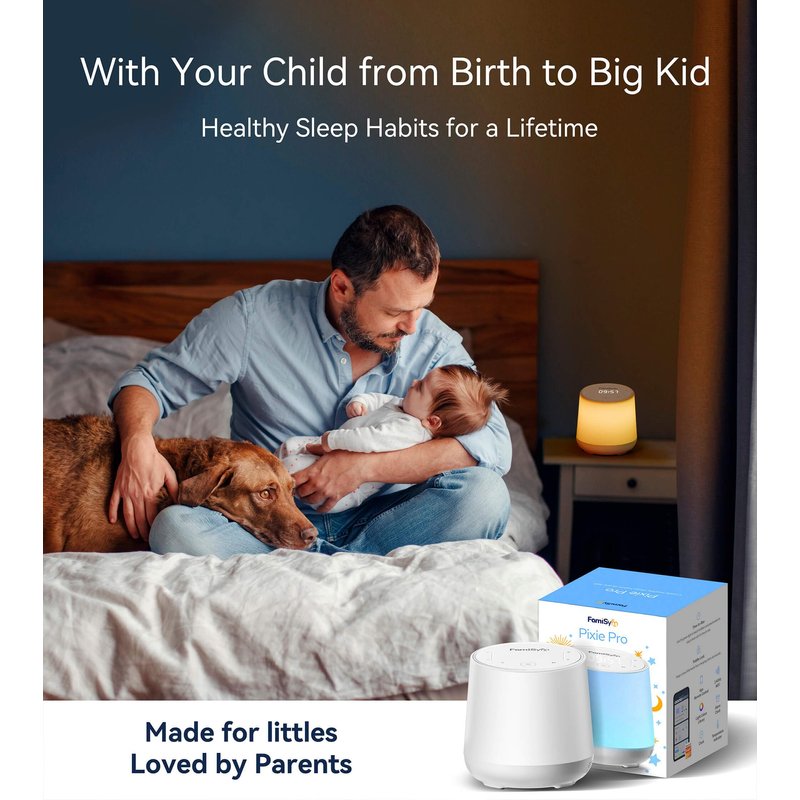 **FamiSym White Noise Sound Machine for Baby Kids* Introducing our latest Pixie Pro smart sound machine, designed to ensure your baby's and kids' restful sleep. With Wi-Fi capability, a dimmable clock and temperature display, an ambient night light, and more features, it promotes healthy sleep at every age and grows with your child. **Adjustable Night Light** This sound machine doubles as a night light with adjustable brightness and RGB colors. It’s an ideal bedside lamp, nursery night light, and night light for kids' rooms, ensuring your baby's peaceful sleep and your peace of mind. **Smartphone Control** Program colors and sounds, adjust settings, and set timers remotely with your smartphone. Customize your favorite sounds on the app and access them easily by touching the 'FmiSym' button on the device. **Sleep Trainer** Build healthy sleep habits with the Pixie Pro. Use light colors to teach your child when it’s time for bed and when it’s okay to wake up. This toddler night light and sleep trainer promotes restful sleep and calm wake-ups, making it perfect for toddler sleep training. **Perfect for Every Nursery** The Pixie Pro is more than just a sound machine. It’s a night light sound machine, nursery lamp, alarm clock for kids, and a calming music machine for sleep. Whether it’s a red night light for newborns, girl nursery decor, or boy nursery essential, this versatile device covers all your needs. It’s also great for toddler sleep and includes features like snooze and flip night light baby. **Track List** white noise, pink noise, brown noise, clothes dryer, hair dryer, vacuum cleaner, fan, floor fan, wind, brook, ocean waves, campfire, light rain, rain hitting plantains, thunderstorm, antique clock, bamboo chime, bleat, bird song, summer night, heartbeat, fetal heart, shushing, café ambiance, ship, aircraft, train, meditation, music box, Twinkle Twinkle Little Star, lullabies